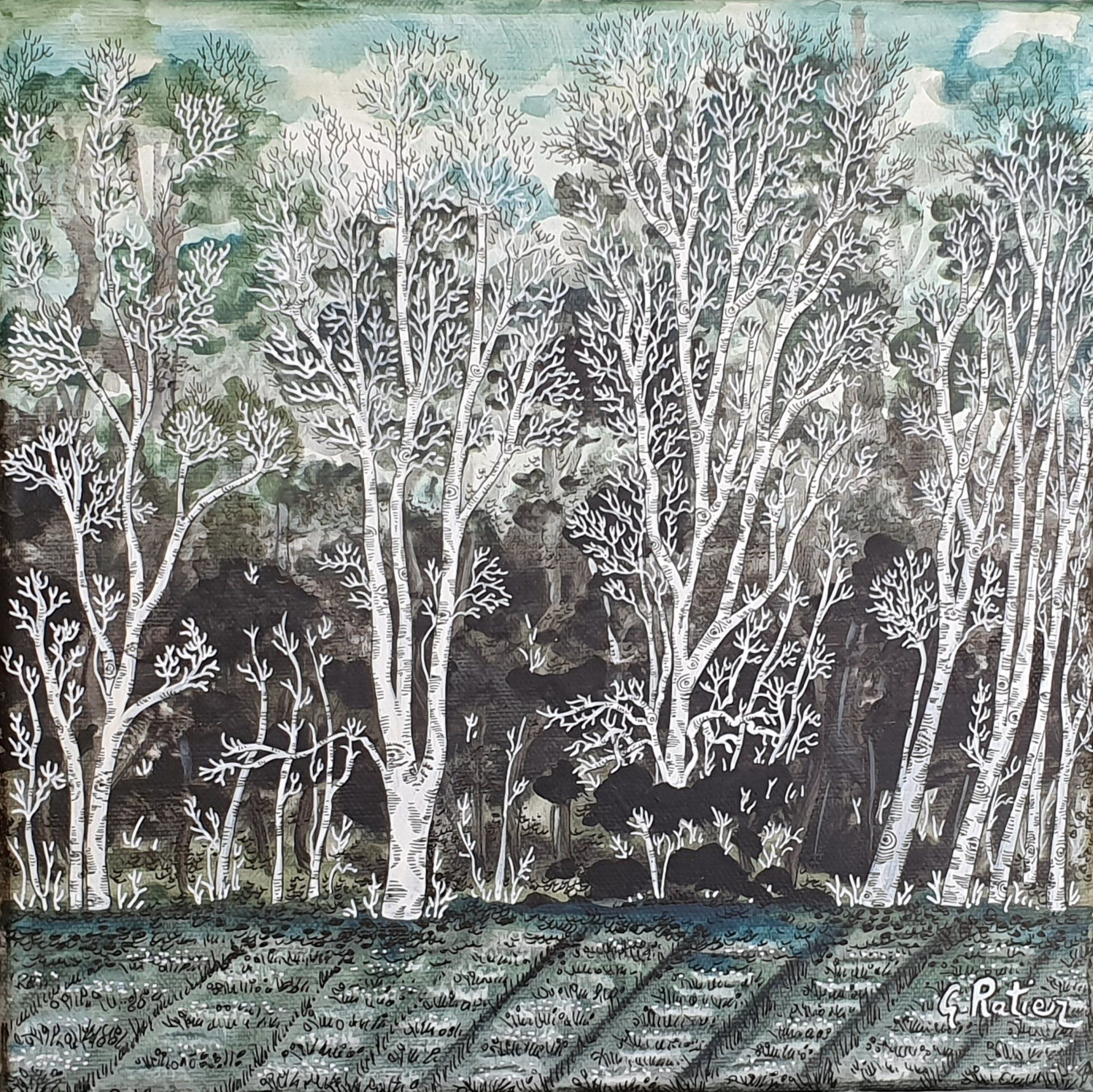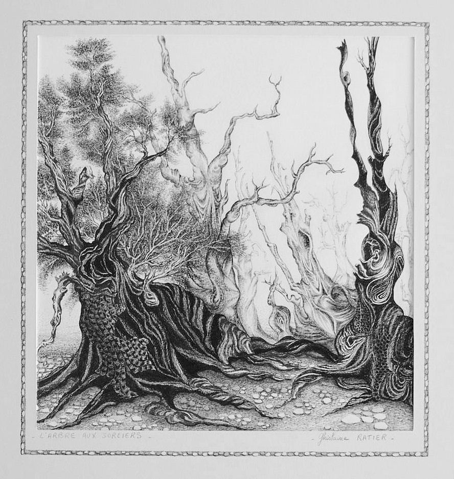 Ma formation première aux Beaux-Arts de Caen étant la gravure (eaux fortes), j'ai gardé ce plaisir de m'exprimer avec d'infinies valeurs de gris et des recherches de matières pour représenter les écorces, les feuillages, les racines. C'est un travail au trait en noir ou avec des encres de couleur et quelquefois un apport d'acrylique.